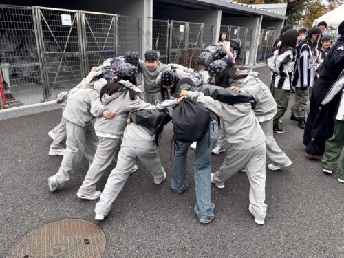 パフォーマンス後は配布されたベースボールシャツを着てサッカー観戦。