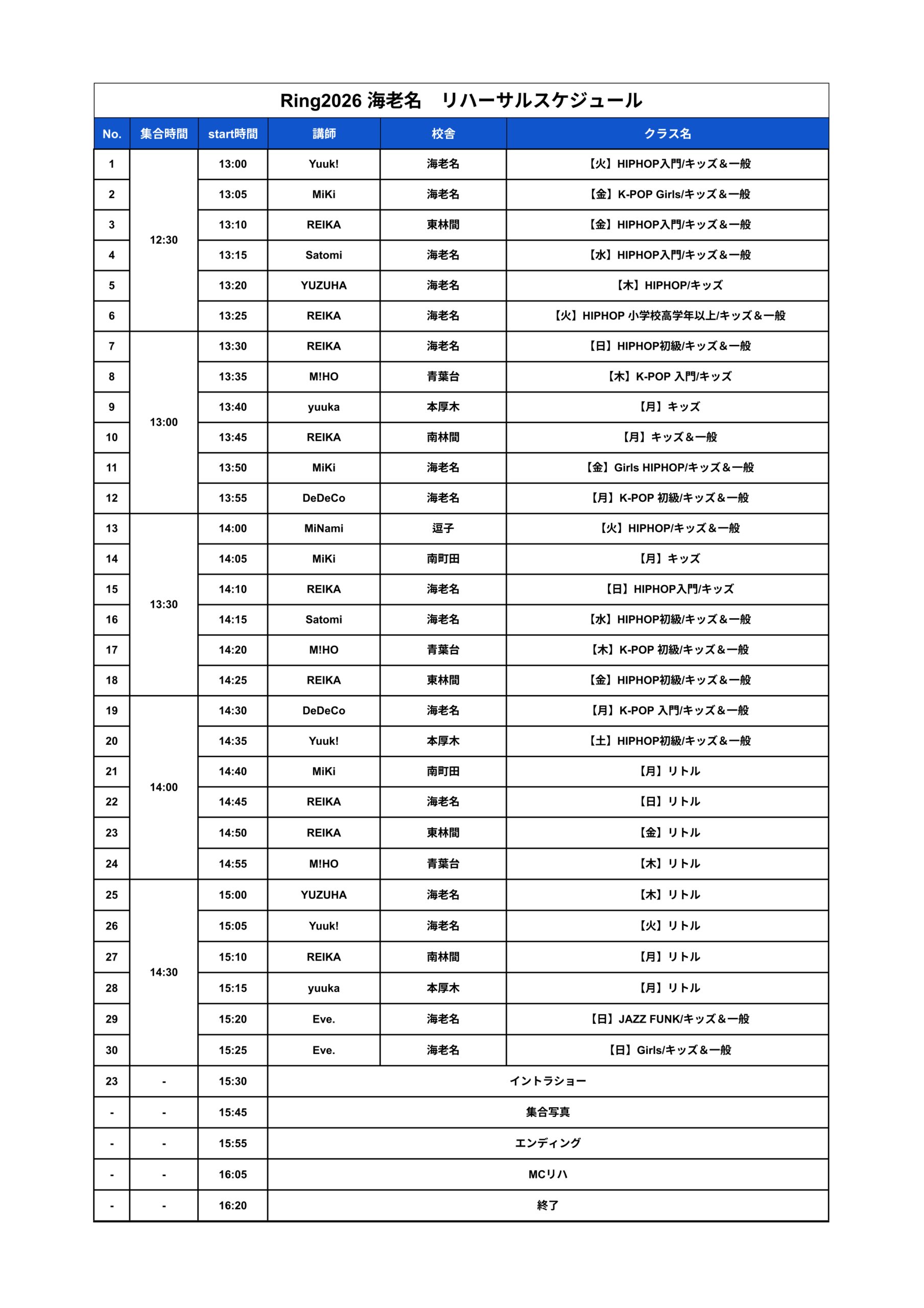 (クラスごとに講師との集合時間が決まっている方は、その時間に集合してください)