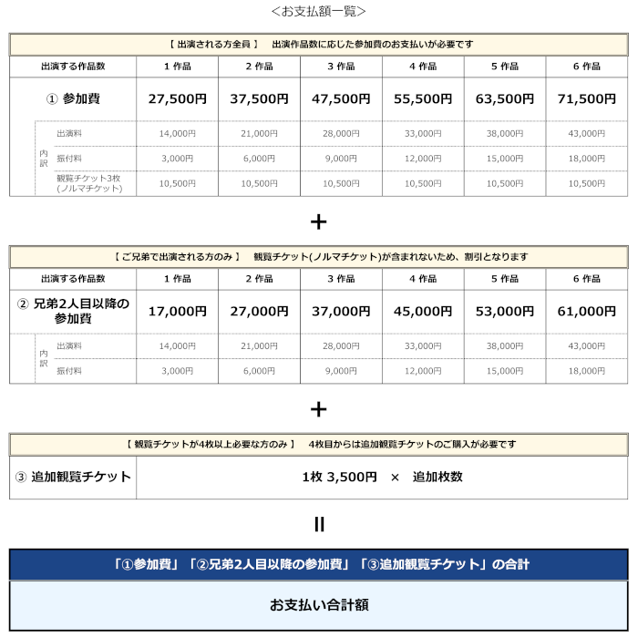 ※ご兄弟で出演される場合、2人目以降の方の出演費に観覧チケット3枚(ノルマチケット)は含まれておりません。チケットが必要な場合は追加観覧チケットをお申込ください。